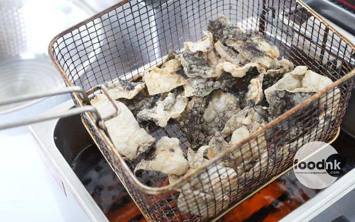 Người thợ sẽ dùng bột phô mai cho vào da ếch đã làm giòn rồi trộn đều. Lúc này, bột phô mai sẽ bám vào da ếch, khi ăn sẽ cảm nhận được độ giòn và trọn vẹn mùi vị của phô mai.